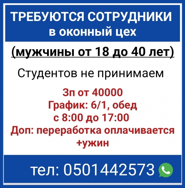 ТРЕБУЮТСЯ СОТРУДНИКИ в оконный цех (мужчины от 18 до 40 лет) Студентов не принимаем