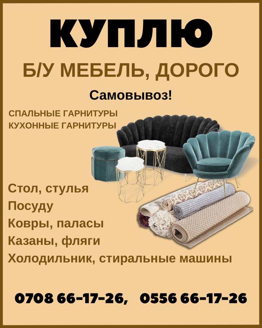 Куплю б/у мебель, дорого\r\n— Спальный и кухонный гарнитуры, кровать;\r\n— Стол, стулья, ковры и паласы;\r\n— Казаны, фляги, холодильник и посуду.\r\nОбращаться по телефону: (Whats App) 0708661726, 0556661726