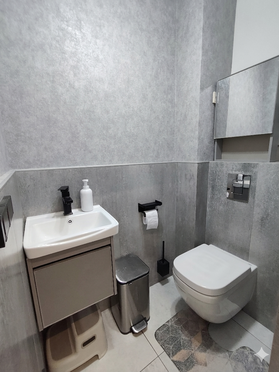 — Санузел раздельный, отделан российским (стены) и испанским (пол) керамогранитом.