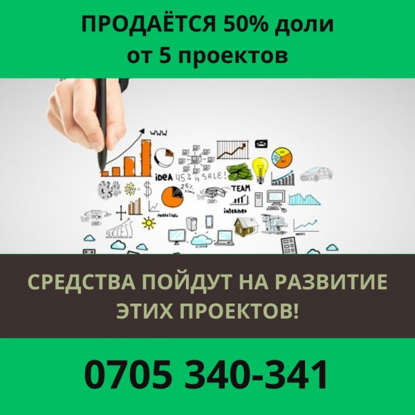 Продается 50 % доли от 5 проектов! Средства пойдут на развитие этих проектов! Все вопросы по телефону! Тел. : Марлен, 0705340341