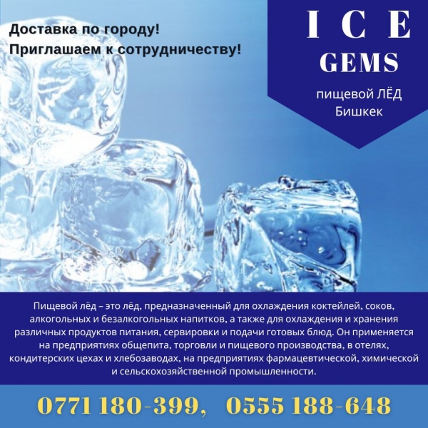 Изготовлен из артезианской воды. Наш лёд не меняет вкуса напитка. Доставка по городу! Приглашаем к сотрудничеству! Справки по тел. : 0771180399, 0555188648