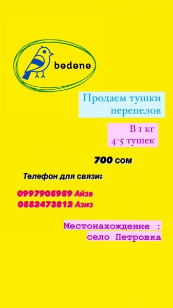 Продаем тушки перепелов! Халал! Халал! Халал! 700 сом 1 кг. Свежие! В 1 кг по 4-6 штучек в зависимости от веса Перепелки. Готовятся в духовке за 30-40 минут. Очень полезное мясо для беременных женщин, для растущего организма, для людей с проблемами пищеварения. Телефон для заказа: 0997905959 Айза. 0552473812 Азиз