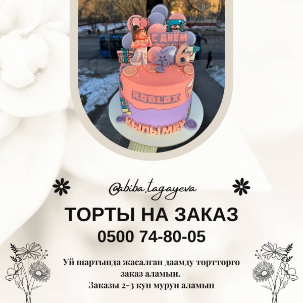 Уй шартында жасалган даамдуу тортторго заказ аламын. Заказды 2-3 кун мурун аламын. Тел. : 0500748005