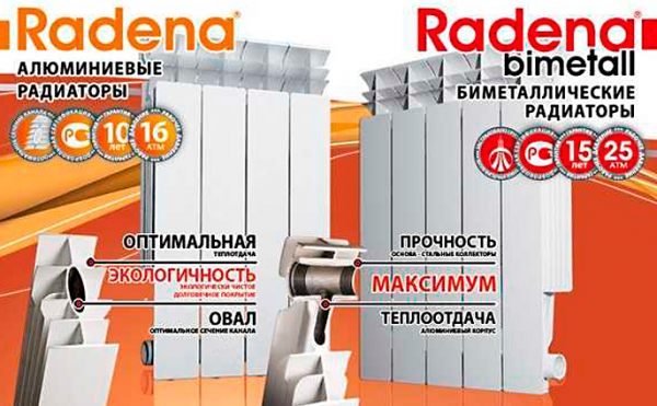Алюминиевые и биметаллические радиаторы Radena - надежное и эффективное решение для обогрева вашего дома. Акция -12% от текущей цены до конца мая! ! ! Алюминиевые радиаторы RADENA - секционные радиаторы, разработанные в Италии в соответствии с европейскими стандартами и с учетом особенностей российских систем отопления. Имеют оптимальное овальное сечение канала, что повышает прочность и теплоотдачу каждой секции
