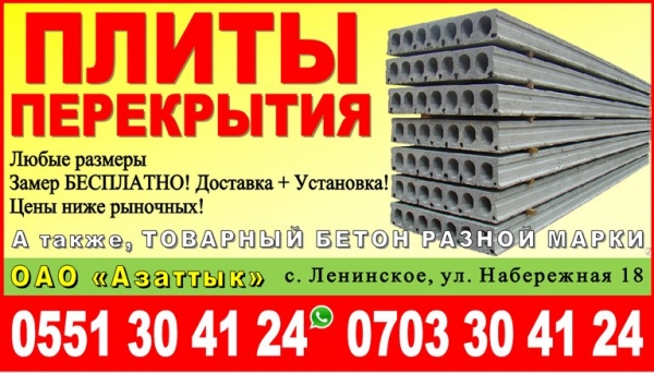 ОАО «Азаттык» - реализует плиты перекрытия, любые размеры. А также, товарный бетон разной марки. Цены ниже рыночных! Замер БЕСПЛАТНО! Доставка + Установка! Миксер доставка! Адрес: г. Бишкек, с. Ленинское, ул. Набережная 18