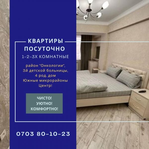 Районы: Онкология, 3-я детская больница, 4-й род. дом, южн. Микрорайоны, Центр. Вас ждут: Чистота! Уют! Комфорт! Все удобства: Интернет(Wi-Fi) , бытовая техника, кондиционер, кабельное телевидение. Чистое белье и полотенца. Цена от 2000 сом и выше. Обращаться по тел. : 0703801023