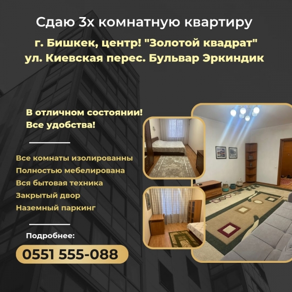Сдается 3-х комнатная квартира по ул. Киевская/Бульвар Эркиндик. *Общая площадь-76кв/м; *Кол-во комнат-3; *Тип строения-кирпич