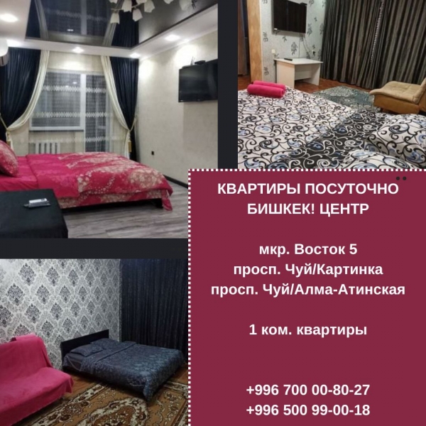 ⇒ кабельное TV 116 каналов (плазменный телевизор) ⇒ WI-FI. ⇒ Кухня оборудована всей необходимой посудой. ⇒ стиральная машинка автомат. холодильник; микроволновка чистое постельное белье, полотенце. Цены: Сутки от 2000 сом. Звоните! Договоримся постоянным клиентам и командировочным предусмотрены скидки! При себе иметь документ, удостоверяющий личность. Обслуживание 24 ч/сутки. Адрес: Мкр. Восток-5
