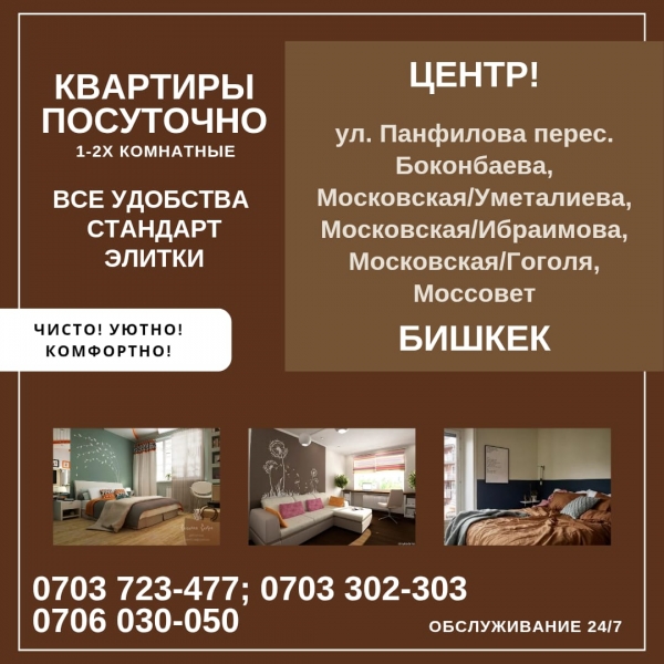 По адресу: ул. Панфилова перес. Боконбаева, Московская/Уметалиева, Московская/Ибраимова (Правда) , Московская/Советская (Моссовет) В квартирах есть все для приятного отдыха