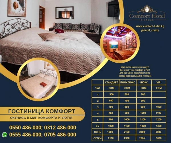 У нас Вы всегда можете быть уверены, что Ваш отдых будет комфортным, приятным и незабываемым. Уборка в квартирах после каждого гостя. Так же номера ежедневно озонируются, поэтому в номерах всегда чистый и приятный воздух. Наслаждайтесь отдыхом без забот. Выбирая «КОМФОРТ», вы выбираете лучшее! Телефоны: +996 555 48 60 00, +996 705 48 60 00, +996 550 48 60 00