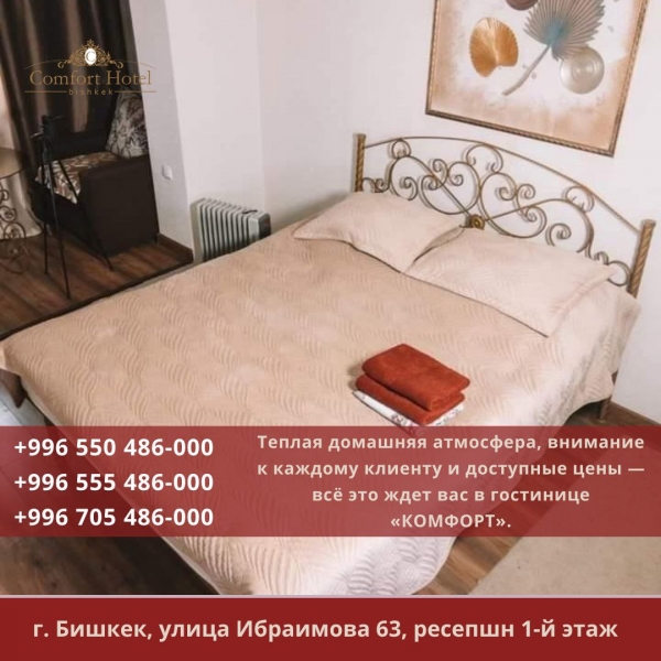 У нас Вы всегда можете быть уверены, что Ваш отдых будет комфортным, приятным и незабываемым. Уборка в квартирах после каждого гостя. Так же номера ежедневно озонируются, поэтому в номерах всегда чистый и приятный воздух. Наслаждайтесь отдыхом без забот. Выбирая «КОМФОРТ», вы выбираете лучшее! Телефоны: +996 555 48 60 00, +996 705 48 60 00, +996 550 48 60 00