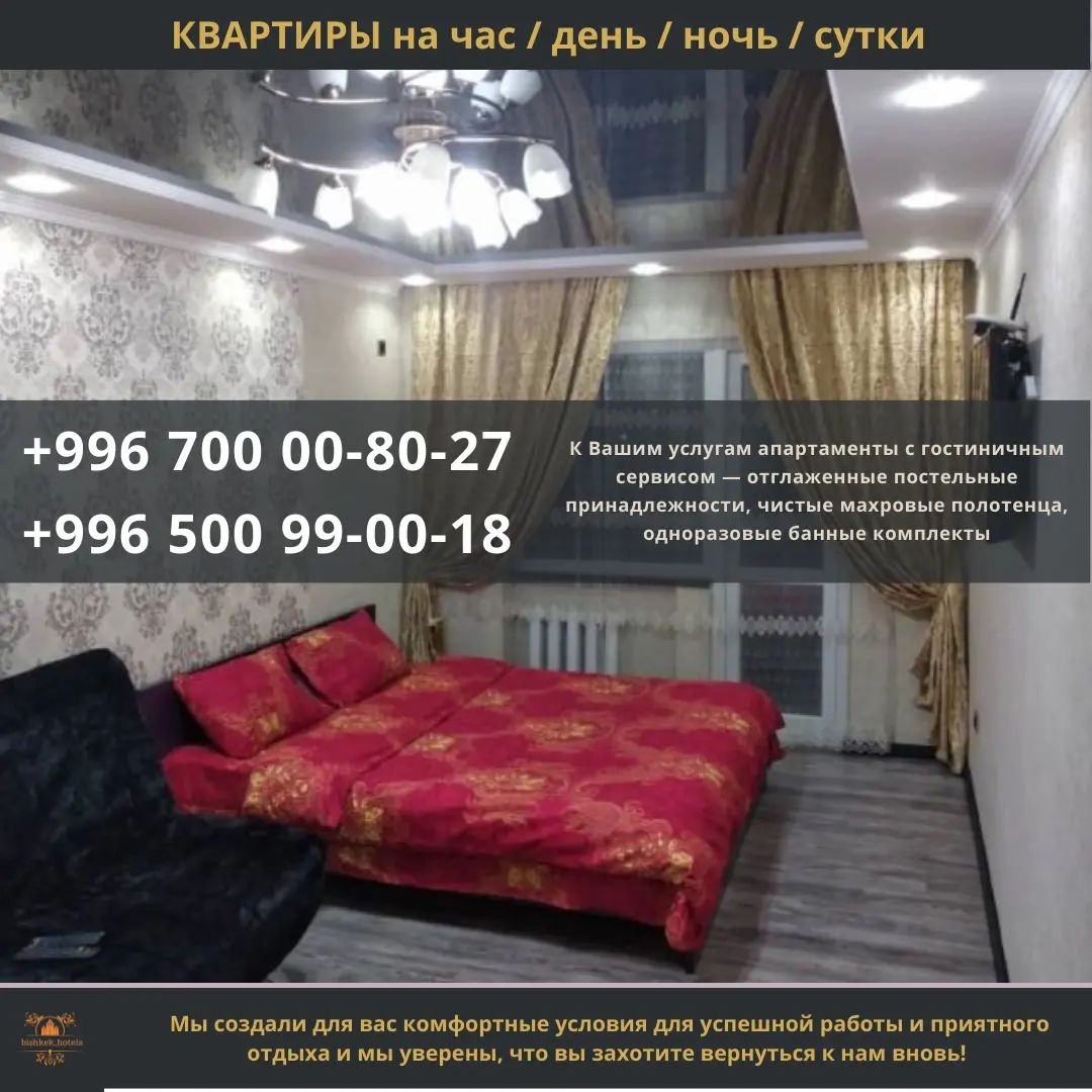 Квартиры посуточно в Бишкеке! Гостиница!\r\n\r\n1 комнатная квартира со всеми удобствами\r\nПо адресу: мкр. Восток-5 (Народный)\r\n\r\nВ квартире есть все для приятного отдыха\r\n⇒ кабельное TV 116 каналов (плазменный телевизор)\r\n⇒ WI-FI.\r\n⇒ Кухня оборудована всей необходимой посудой.\r\n⇒ стиральная машинка автомат. холодильник; микроволновка чистое постельное белье, полотенце.\r\n\r\nЦены: Сутки - от 2000 сом\r\nЗвоните! Договоримся постоянным клиентам и командировочным предусмотрены скидки!\r\nПри себе иметь документ, удостоверяющий личность.\r\nОбслуживание 24 ч/сутки.\r\nАдрес: мкр. Восток-5\r\n\r\nВСЕ ВОПРОСЫ ПО ТЕЛЕФОНУ!\r\nСпасибо за понимание;)\r\nКонтакты: 0500990018, 0700008027