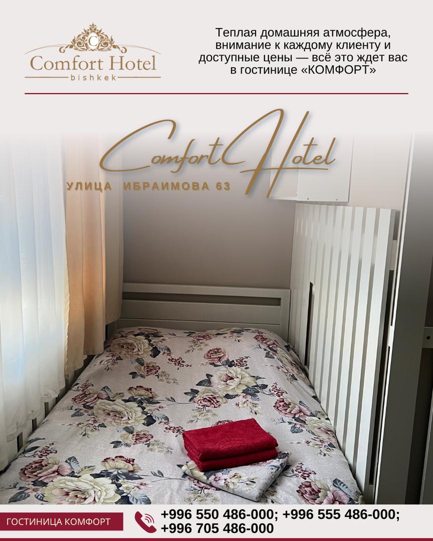 Гостиница в Бишкеке. ГОСТИНИЦА «КОМФОРТ» БИШКЕК\r\nК Вашим услугам:\r\nНомера классов «VIP», «ЛЮКС», «ЕВРО/ЛЮКС» и «Эконом»\r\nВ номерах Вас ждут:\r\n— Спутниковое ТВ во всех номерах;\r\n— Комнаты оснащены кондиционером;\r\n— Высокоскоростной Интернет (Wi-Fi) во всех номерах;\r\n— Круглосуточный Бар, заказ блюда европейской кухни доставка в номер.\r\nЕсть все для Вашего комфортного времяпровождения и приятного отдыха.\r\nВас ждут: ЧИСТОТА! УЮТ! КОМФОРТ!\r\n\r\nПрайс-лист:\r\n\r\n— номера класса «Стандарт»: 1 час — 600 сом, 2 часа – 700 сом, ночь 2100 сом, сутки 2300 сом.\r\n— номера класса «полуЛюкс»: 1 час — 700 сом, 2 часа – 800 сом, ночь 2300 сом, сутки 2500 сом.\r\n— номера класса «ЛЮКС»: 1 час — 800 сом, 2 часа – 900 сом, ночь 2500 сом, сутки 2700 сом.\r\n— номера класса «VIP»: 2 часа – 1100 сом, 3 часа - 1200, ночь 2700 сом, сутки 3200 сом.\r\n\r\n+ Последующие часы по 100 сом.\r\n\r\nАдрес: ул. Ибраимова 63, 1 этаж (рынок Комфорт)\r\nТелефоны:\r\n+996312486000,\r\n+996555486000,\r\n+996705486000,\r\n+996550486000