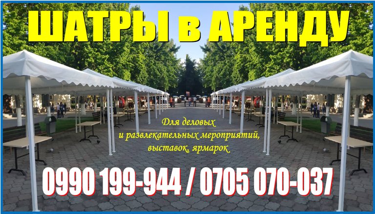 Аренда шатров в Бишкеке! Сдаю в аренду шатры.\r\nУ вас намечается торжество? Но в то же время вам хочется отдохнуть на свежем воздухе или провести конференцию вдали от городского шума и пыли? Оптимальным для вас вариантом станет аренда шатров.\r\nВозможны варианты использования тентовых шатров и для размещения различных служб при проведении крупномасштабных мероприятий: охранные центры, мобильные штабы, медицинские пункты. Услуга недорогой аренды тентов для свадеб, пикников, корпоративов, презентаций, выставок и просто отдыхе на природе или в парках, востребована коммерческими структурами и частными индивидуальными предпринимателями, которые планируют развивать свои площадки. Аренда шатров от 1 дня и более.\r\nСправки по тел.: 0990199944, 0705070037