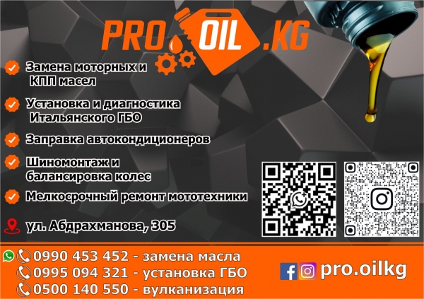 Пункт замены масла Pro_oil kg в Бишкеке, приглашает Вас на замену масел и всех расходников в вашем автомобиле. Наша команда - с радостью поможет обслужить ваш автомобиль. Ведь мы выполняем свою работу на высоком уровне, в срок и с учётом всех пожеланий клиента. Наши опытные и квалифицированные сотрудники подберут подходящее именно вашему автомобилю масло и фильтра. Мы предлагаем моторные масла от ведущих производителей Японии и Европы по доступным ценам. В нашем ассортименте масла только проверенных брендов. А время ожидания своего авто, можно провести в прохладной зоне, где вы можете выпить прохладительные напитки. Команда Pro_oil kg так же предлагает услуги: 1. Установки и диагностики газобаллонного оборудования