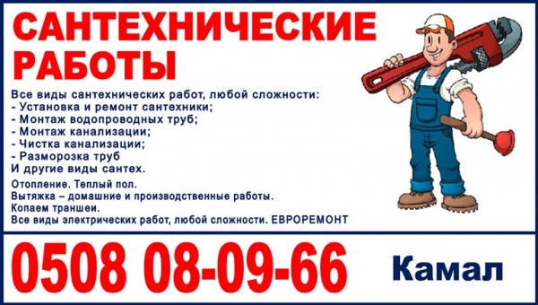 Все виды сантехнических работ, любой сложности: - Установка и ремонт сантехники; - Монтаж водопроводных труб; - Монтаж канализации; - Чистка канализации; - Разморозка труб. И все остальные виды сантехнических работ. Уборка на дому (клининг) . Евроремонт. Клеим обои. Шпаклевка. Отопление. Теплый пол. Вытяжка – домашние и производственные работы. Копаем траншеи. Все виды электрических работ, любой сложности. Качественно! Не