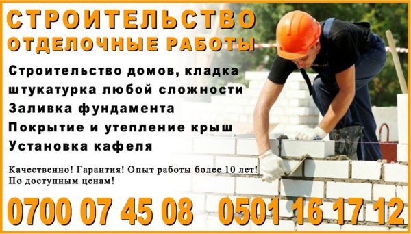 Строительные и отделочные услуги Бишкек. Строительная бригада предоставляет строительные и отделочные услуги: -Строительство домов, кладка, штукатурка любой сложности; -Заливка фундамента; -Покрытие и утепление крыш; -Установка кафеля; Качественно! Гарантия! Опыт работы более 10 лет! По доступным ценам! Обращаться по тел. : 0700074508, 0501161712