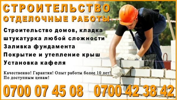 Строительные и отделочные услуги Бишкек. Строительная бригада предоставляет строительные и отделочные услуги: - Строительство домов, кладка, штукатурка любой сложности; - Заливка фундамента; - Покрытие и утепление крыш; - Сварка, сантехника, электрика; - Установка кафеля; Качественно! Гарантия! Опыт работы более 10 лет! По доступным ценам! Обращаться по тел. : 0700074508, 0700423842