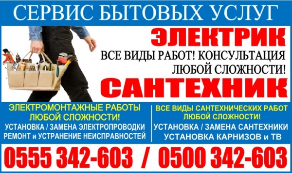 — Установка раковин, унитазов; — Замена смесителей; — Ремонт и установка Аристонов (Бойлеров) ; — Установка Карнизов; — Установка ТВ; — Установка раковин, душевых кабин, унитазов (и другие виды сантехнических услуг) . Быстро! Качественно! Консультация! Обращаться по телефону: 0555342603, 0500342603
