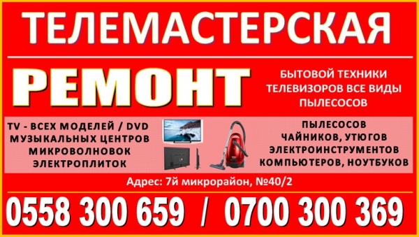 Телемастерская! Ремонт бытовой техники! Ремонт: — TV (ЖК и LED) ; — DVD, Муз. Центров; — Микроволновок; — Электроплиток; — Пылесосов; — Чайников, утюгов; — Фенов, мясорубок; — Электроинструментов; — Компьютеров; — Ноутбуков; Адрес: г. Бишкек, 7й мкр. , №40/2