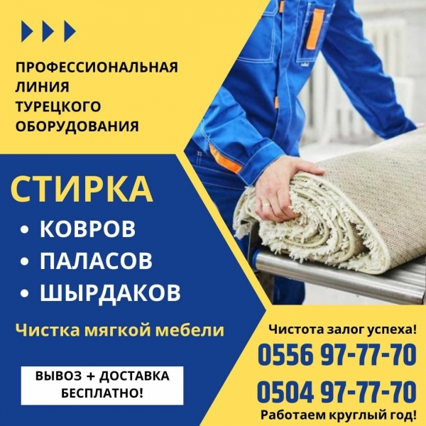 ТОЛЬКО У НАС! ПРОФЕССИОНАЛЬНАЯ ЛИНИЯ ТУРЕЦКОГО ОБОРУДОВАНИЯ ДЛЯ СТИРКИ КОВРОВ! Стирка ковров, паласов, шырдаков. Чистка мягкой мебели в Бишкеке! — Оплата при получении! — Работаем без выходных! — Работаем круглый год, в любую погоду! Чистота залог успеха! Вывоз + Доставка БЕСПЛАТНО! Справки по тел. : 0556977770, 0504977770