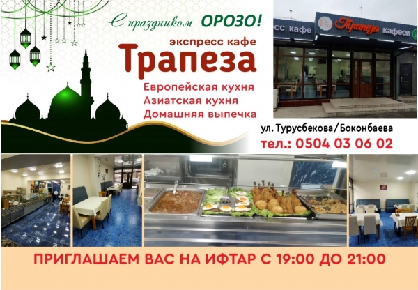 Проведите ифтар в атмосфере душевного общения с родными и близкими людьми в экспресс кафе «Трапеза»! Наша команда разработала несколько вариантов для вашего Ифтара. Принимаем заказы от 4 человек. Мы порадуем вас национальной, восточной, европейской кухнями по доступным ценам! Вкусно! Сытно! Уютно! Наш адрес: г. Бишкек, ул. Турусбекова (перес. Боконбаева) Тел. : 0504030602