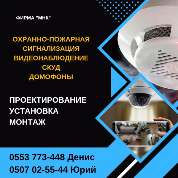 Установка и обслуживание охранной сигнализации и систем безопасности. Наша компания оказывает следующие услуги: Проектированиe систем охранно-пожарной сигнализации и видеонаблюдения; Монтаж, наладку и обслуживание охранно-пожарной сигнализации; Монтаж, наладку и обслуживание систем видеонаблюдения; Монтаж и испытание электрооборудования; Приезд специалистов для составления сметных расчетов; СКУД (Система контроля и управления доступом) ; Домофоны. Тел. : 0553773448 (Денис) , 0507025544 (Юрий)