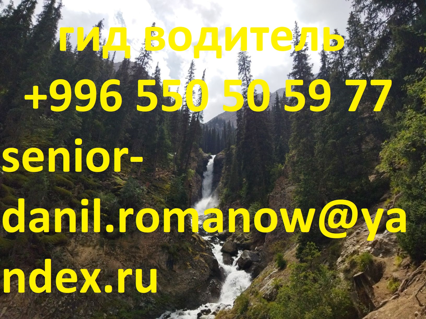 Здравствуйте, меня зовут Данил. Я являюсь профессиональным гидом и водителем в Кыргызстане. Покажу вам не туристический Кыргызстан, помогу почувствовать неповторимую атмосферу и аутентичность этой славной страны, покажу всю ее незабываемую, историю и природу. Вы решаете, хотите вы сейчас отдохнуть или едем дальше, сколько времени мы проведем в том или ином месте, где и когда вы хотите пообедать и поужинать и во сколько начнется программа на следующий день. Вы приехали отдохнуть, и я постараюсь использовать каждую минуту вашего времени именно так, как вы хотели бы ее провести с максимальной пользой и наслаждением от Кыргызстана. Туры и экскурсии провожу на собственном полноприводном комфортабельном автомобиле. Tel: +996 550 50 59 77, WhatsApp: +996 550 50 59 77