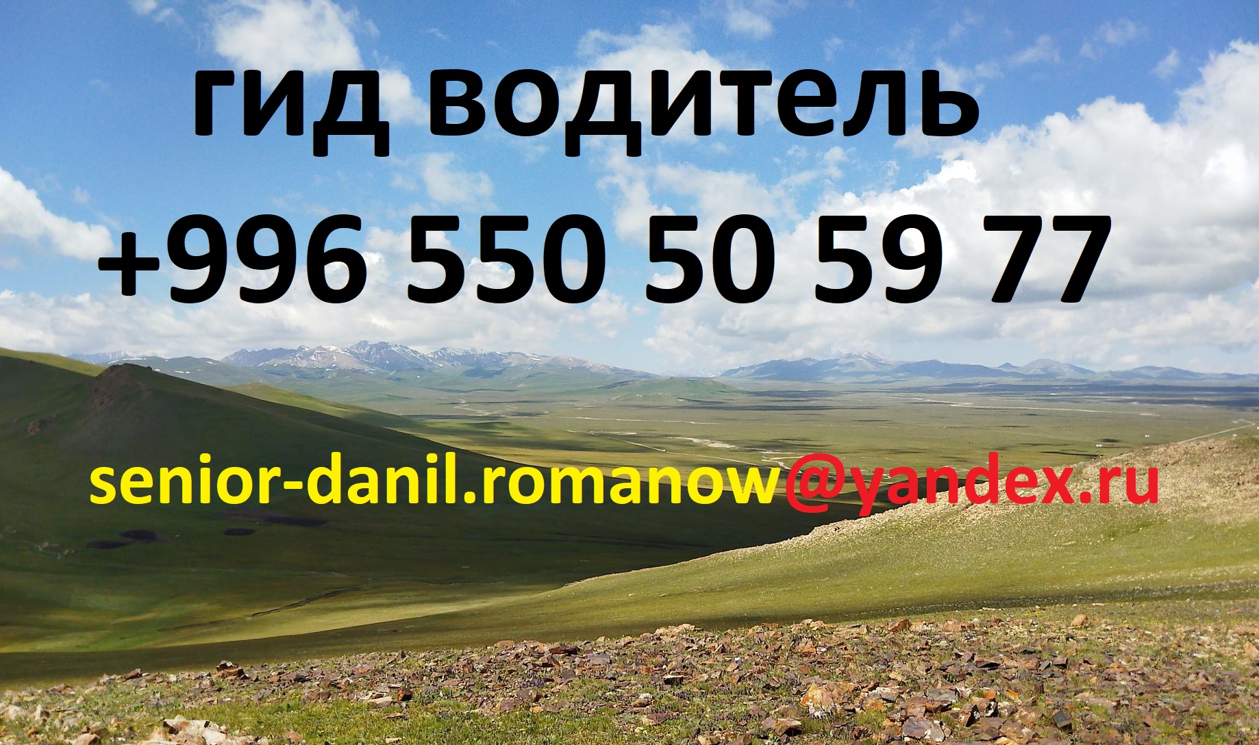 Bienvenue au Kirghizistan! Je m\'appelle Daniel. Je suis guide et chauffeur qui a 15 ans d\'expérience dans le domaine du tourism. Je parle couramment russe, anglais et français. Je fais des tours à pied et en voiture personnelle. Si vous voulez recevoir une expérience inoubliable de votre voyage dans un pays aussi magnifique comme Kirghizistan, alors vous avez choisi un bon guide. Je fais différents itinéraires en fonction de vos desirs. Je peux vous proposer des excursions intéressantes, des programmes avec des impressions inoubliables. Je suis sûr qu\'après nos voyages à travers du pays, vous voudrez certainement revenir ici! Tel: +996 550 50 59 77, WhatsApp: +996 550 50 59 77