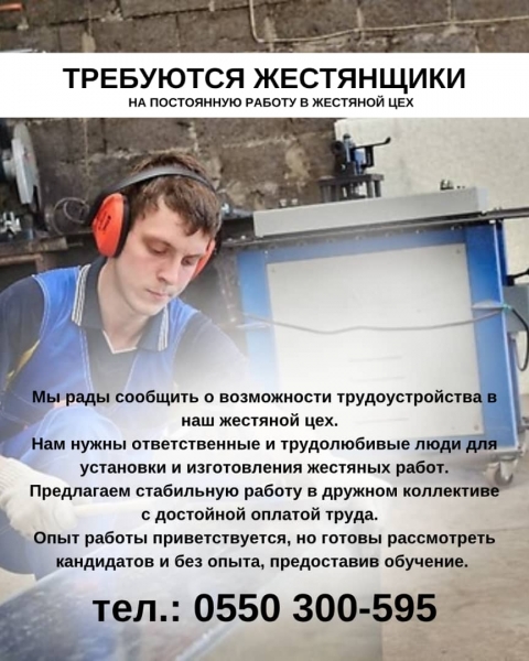Мы рады сообщить о возможности трудоустройства в наш жестяной цех. Нам нужны ответственные и трудолюбивые люди для установки и изготовления жестяных работ. Предлагаем стабильную работу в дружном коллективе с достойной оплатой труда. Опыт работы приветствуется, но готовы рассмотреть кандидатов и без опыта, предоставив обучение. Ждем ваших откликов и надеемся на взаимовыгодное сотрудничество. Тел. : есть WhatsApp, 0550300595