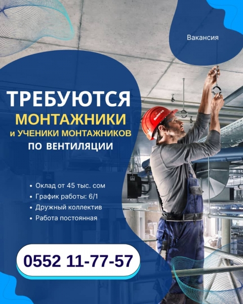 Требуются монтажники и ученики монтажников по вентиляции Оклад - от 45000сом Г