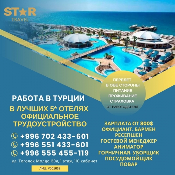 Работа в лучших 5* отелях Турции. Мы предоставляем официальное трудоустройство. Номер лицензии: 001638
