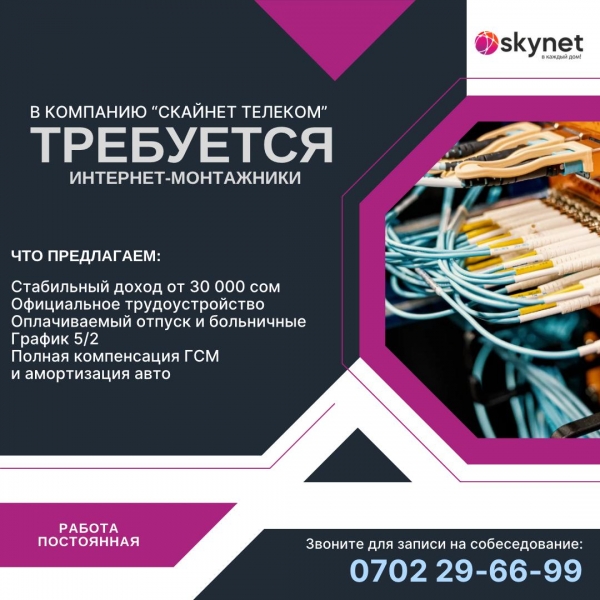 В компанию «Скайнет Телеком» требуются монтажники по установке интернета! Мы предлагаем: стабильный доход от 30 000 сом; официальное трудоустройство, оплачиваемый отпуск и больничные; график работы 5/2